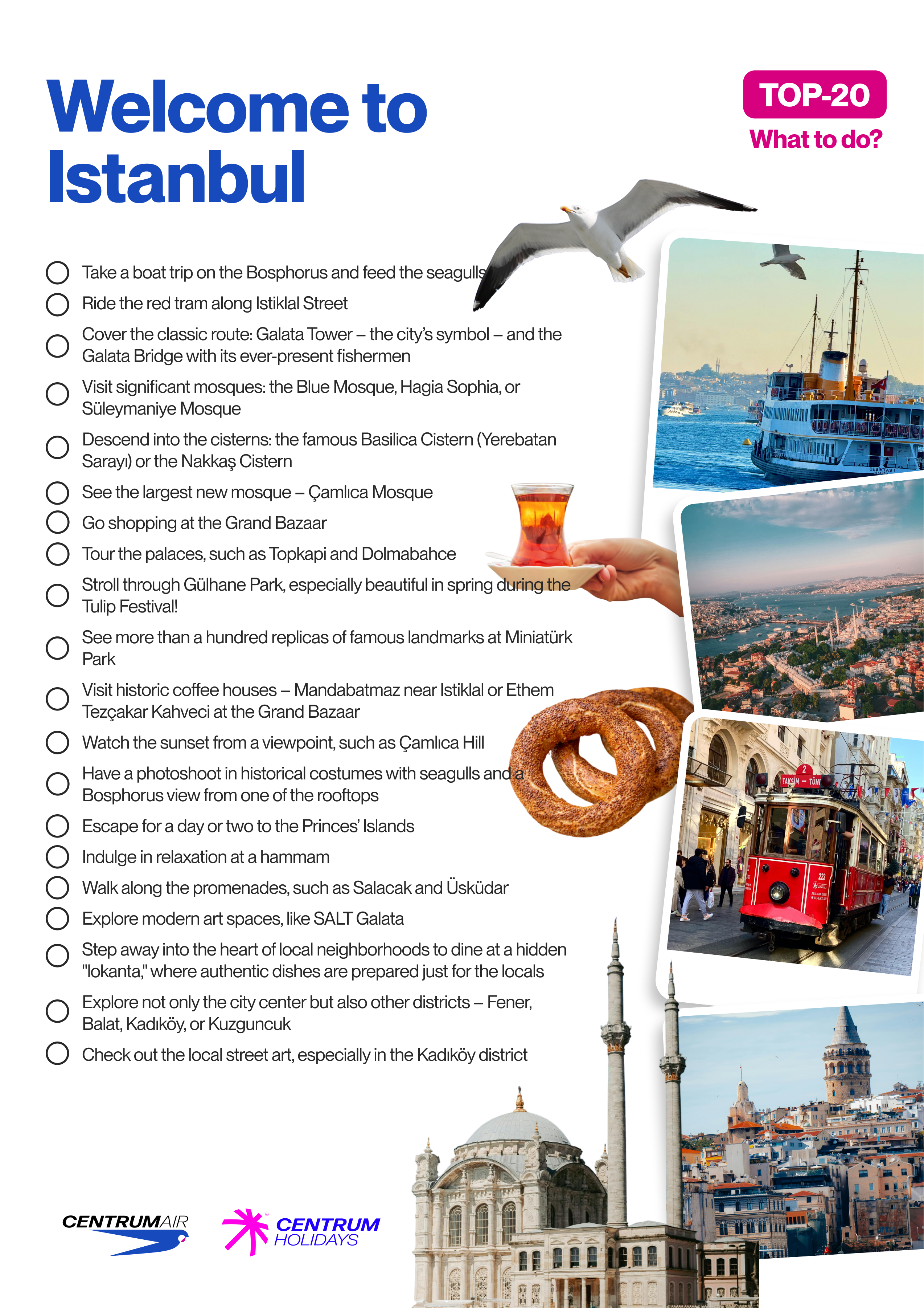Istanbul moves through different rhythms: mornings begin with the call to prayer, days fill with markets and ferries, and evenings fade into the lights of the Bosphorus. It’s a place where you can get lost and find your own direction at the same time. This checklist helps you build a route where Istanbul unfolds step by step – from first impressions to personal discoveries.