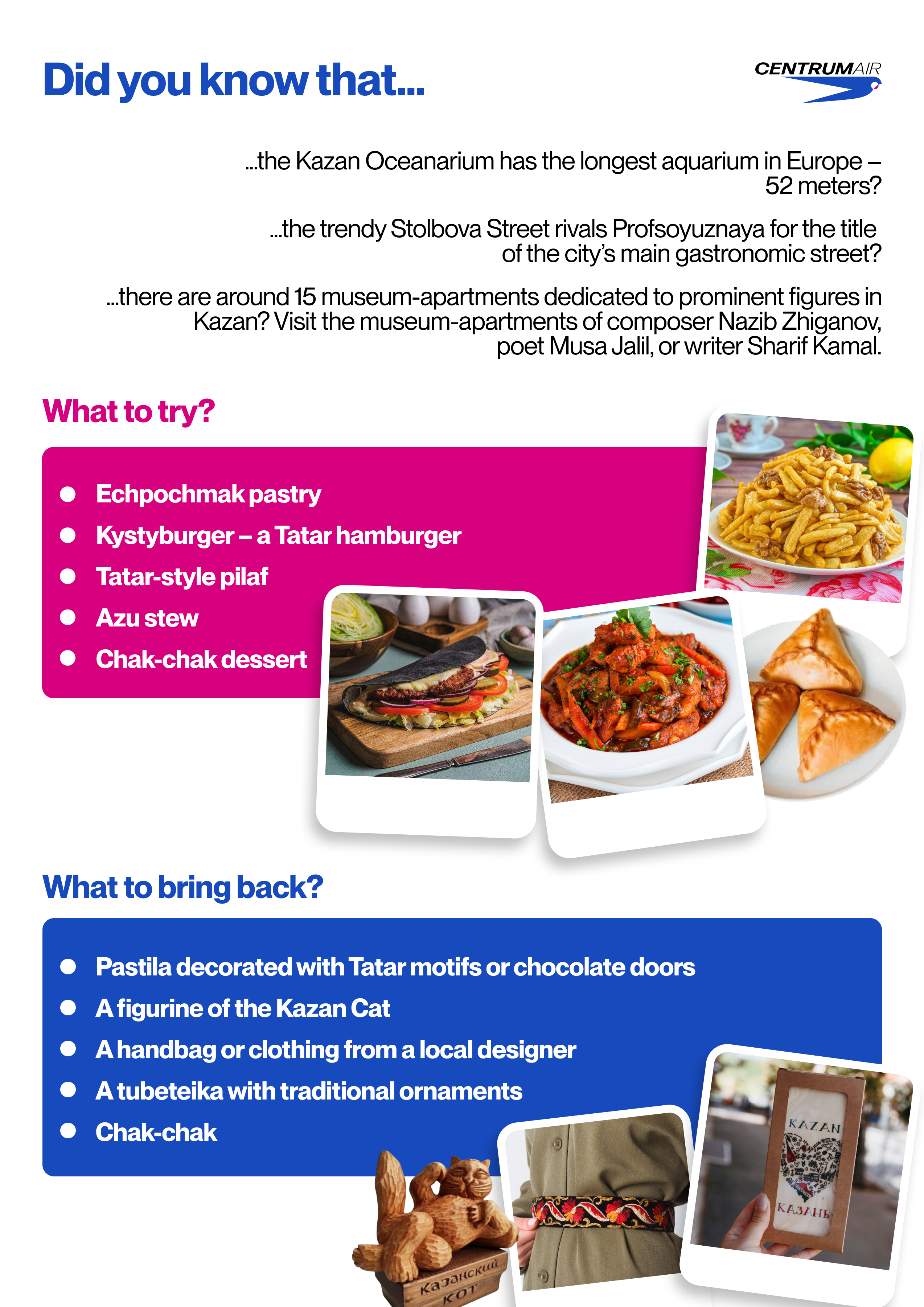 Kazan is experienced through details: footsteps on old streets, reflections on the white walls of the Kremlin, the scent of fresh pastries. There’s no need to rush – the city builds the route for you, leading from one place to another. This checklist helps you stay in rhythm and experience Kazan as a continuous, rich journey.