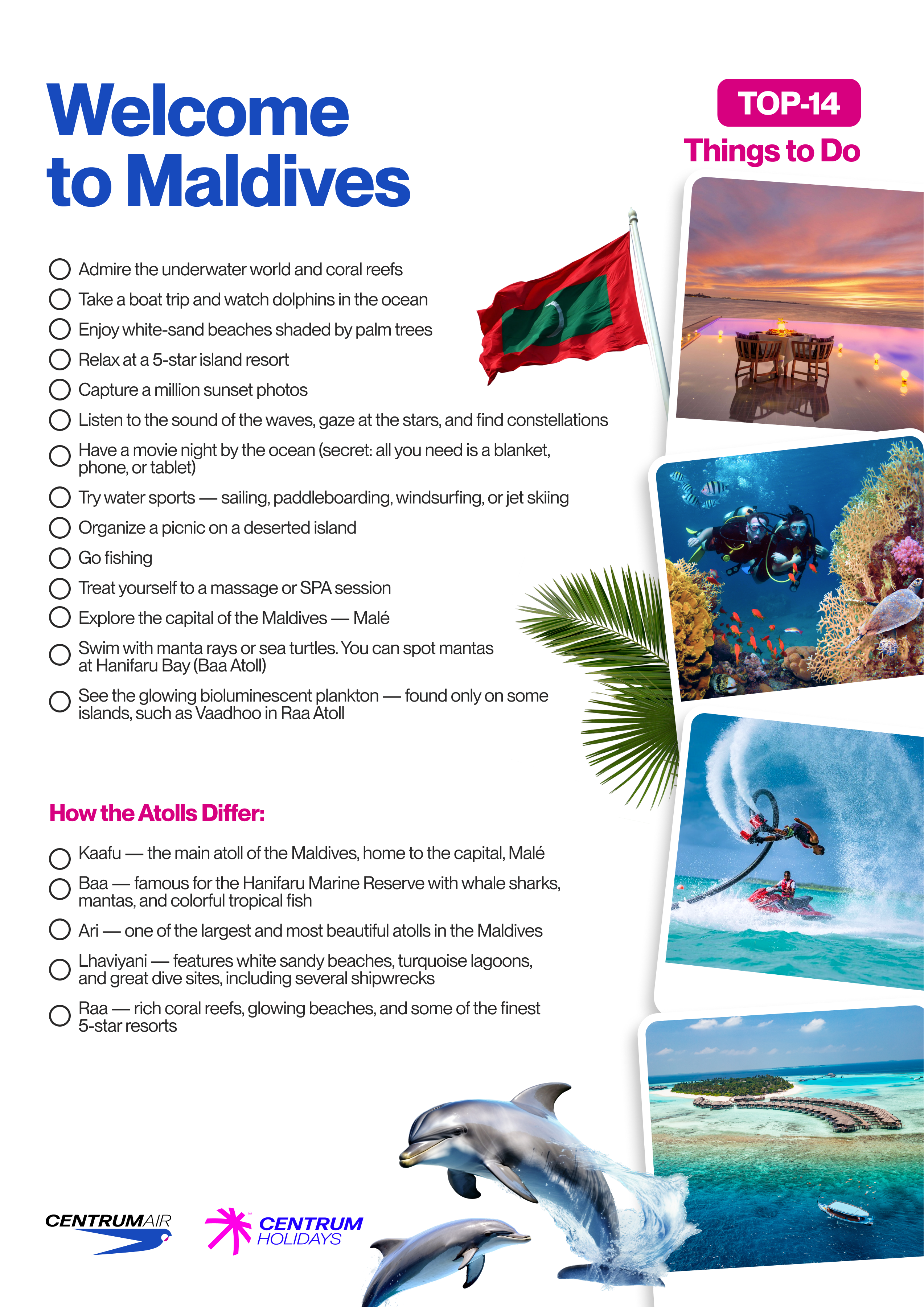 The Maldives is a place where the ocean sets the rhythm of the day and the horizon feels endless. Here you can wake up on an island in the middle of the Indian Ocean, dive among coral reefs, watch the sunset on a white beach, and end the day under the stars. To make your journey unforgettable, we’ve created a checklist of experiences to begin your Maldives adventure.