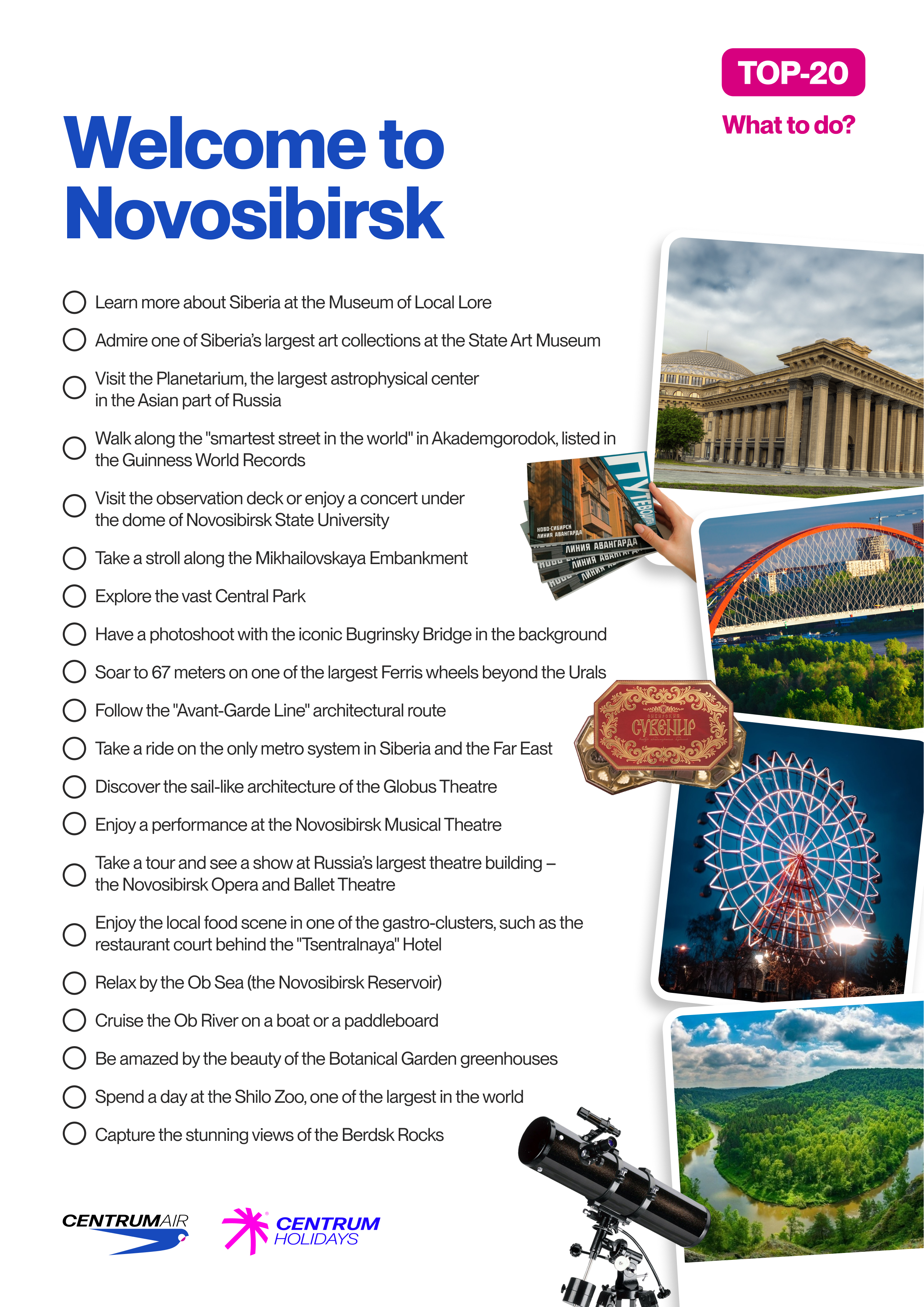 Novosibirsk is defined by scale and distance. Wide avenues, long routes and a city that doesn’t reveal itself at once. You move through it step by step – from the center to the embankment, from city life to the quiet of Akademgorodok. This checklist helps you set the pace and experience Novosibirsk as a continuous journey.