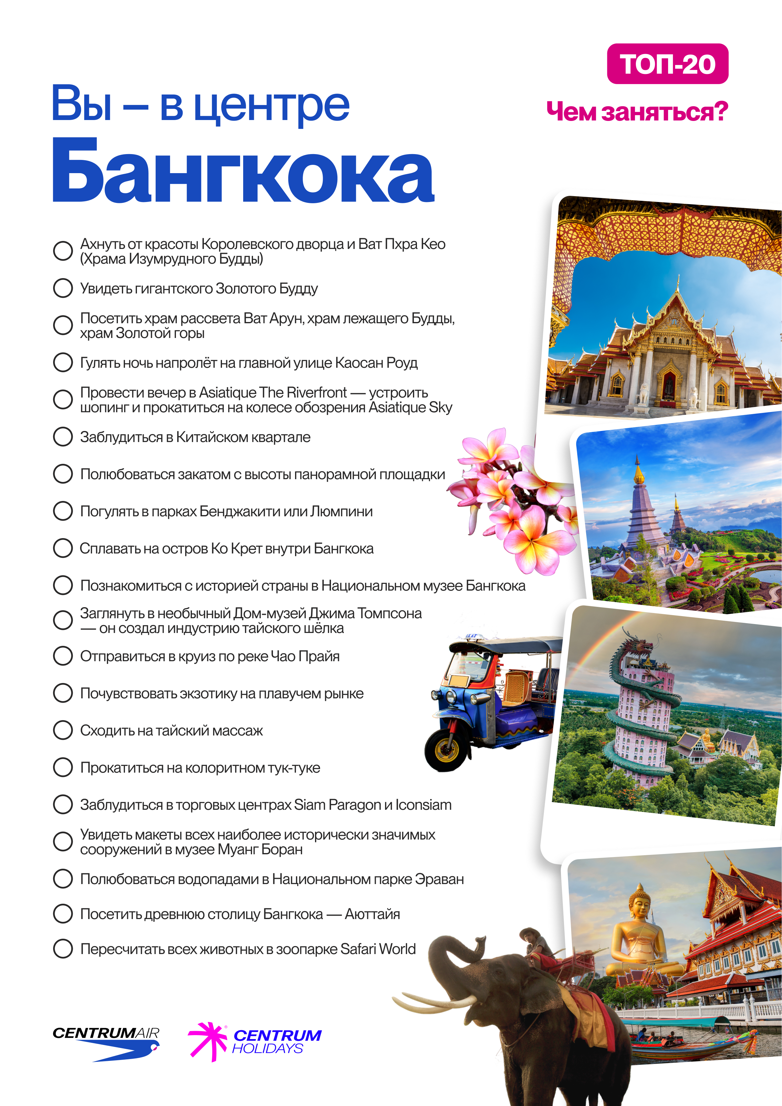 Бангкок – это город, который не замедляется ни на секунду. Здесь золотые храмы соседствуют с неоновыми огнями, рынки – с небоскрёбами, а уличная еда становится частью культуры. Этот чек-лист поможет не потеряться в ритме мегаполиса и собрать своё идеальное путешествие – от первых шагов до самых ярких открытий.