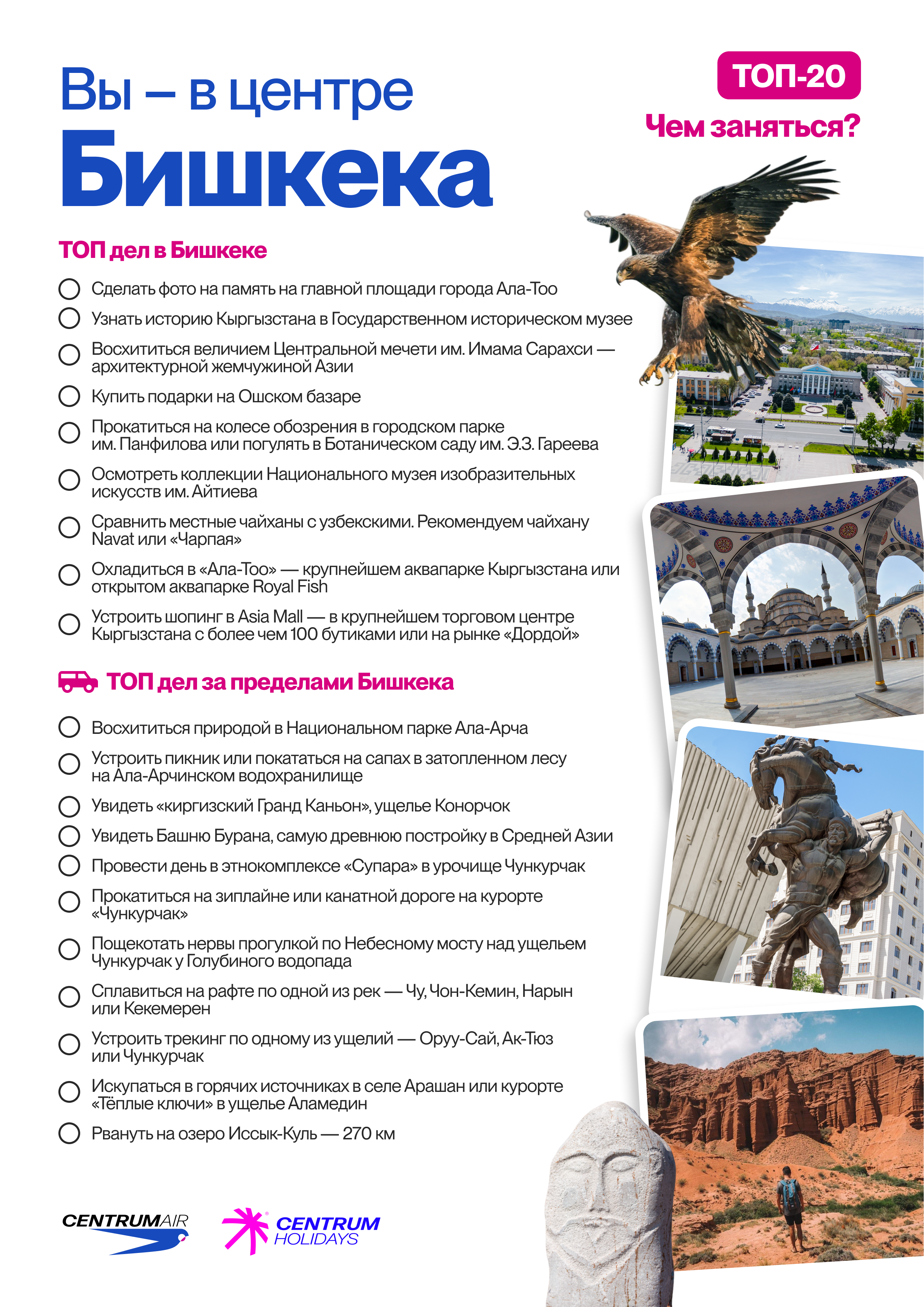 Бишкек – город, где не нужно спешить. Здесь всё строится вокруг пространства: широкие улицы, зелёные парки и горы, которые всегда рядом. Маршрут складывается легко – от городских прогулок к выездам за пределы. Этот чек-лист поможет задать направление и прожить Бишкек в своём ритме.