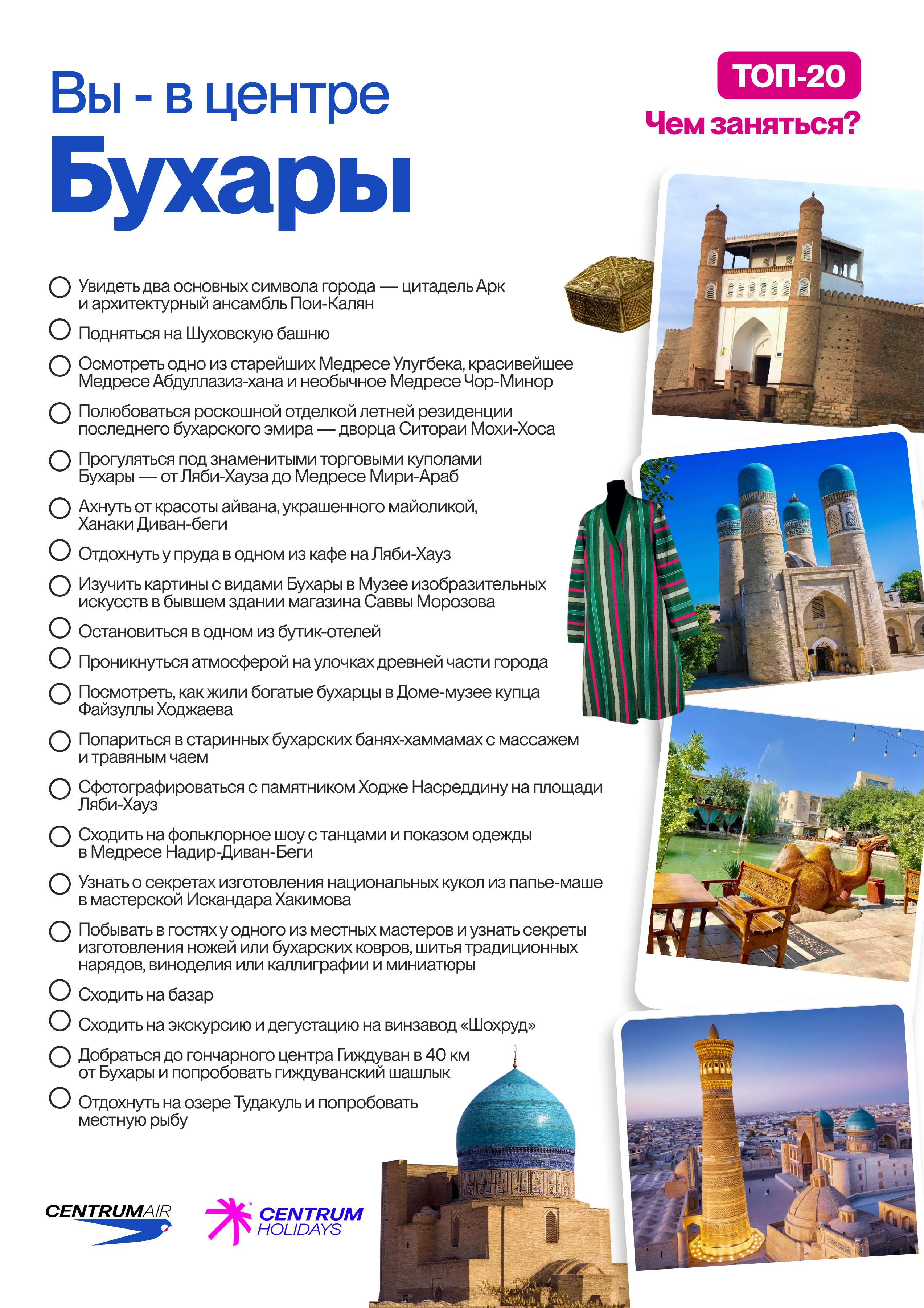 Бухара – один из древнейших городов Центральной Азии, где время словно замедляется. Здесь узкие улицы ведут к старинным медресе и мечетям, на площадях звучит шум базаров, а минареты напоминают о временах Великого Шёлкового пути. Чтобы почувствовать атмосферу города и не пропустить самые интересные места, мы подготовили чек-лист впечатлений, с которых стоит начать знакомство с Бухарой.