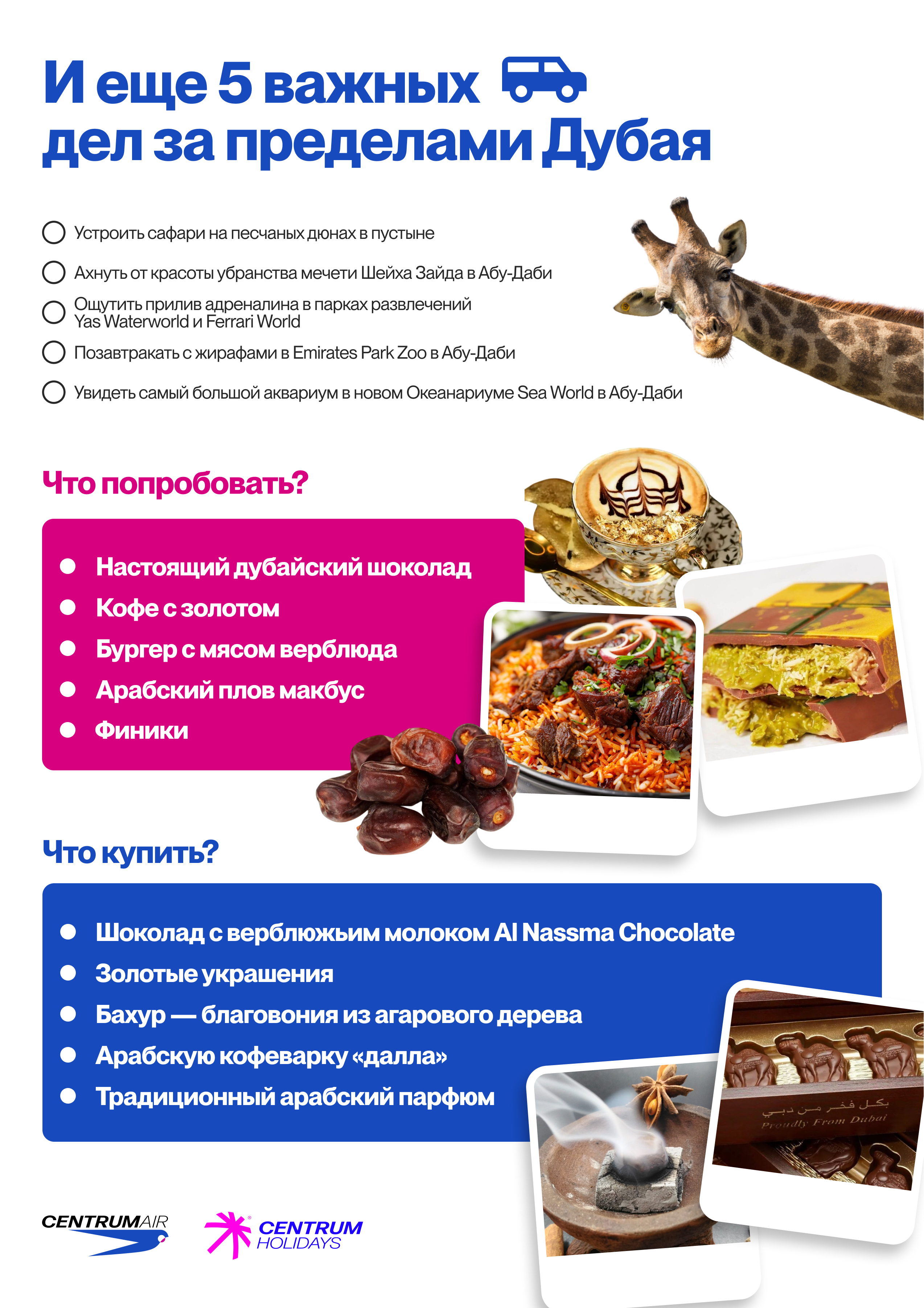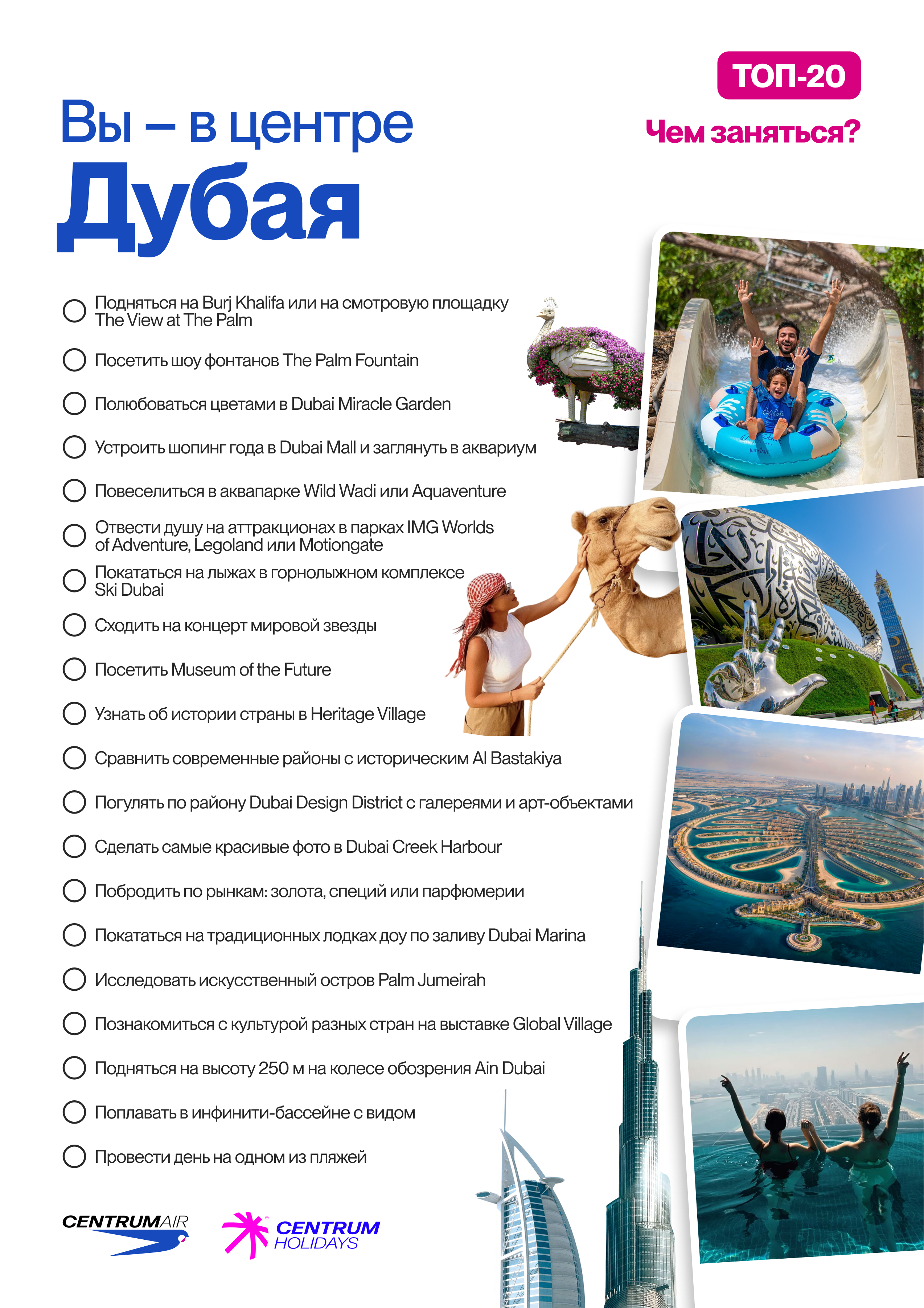 Дубай – это город, где невозможное становится нормой. Здесь небоскрёбы уходят в облака, пустыня начинается за горизонтом, а каждый день предлагает новый масштаб впечатлений. Этот чек-лист поможет не потеряться в разнообразии и собрать свой идеальный маршрут – от классики до неожиданных открытий.