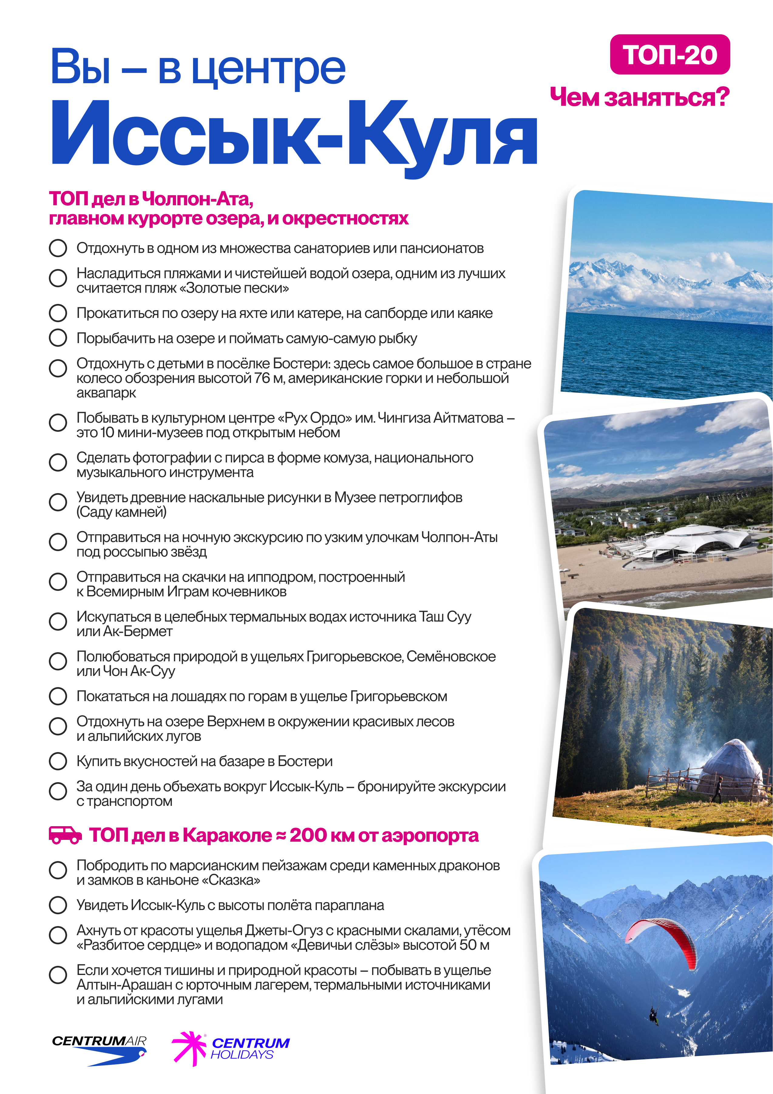 Иссык-Куль – это ощущение простора, в котором вода и горы задают всё. Здесь день не перегружен планами: он течёт спокойно, между берегом и горизонтом. Утро – у воды, день – в дороге вдоль озера, вечер – в тишине. Этот чек-лист поможет собрать маршрут, в котором главное – не скорость, а ощущение места.