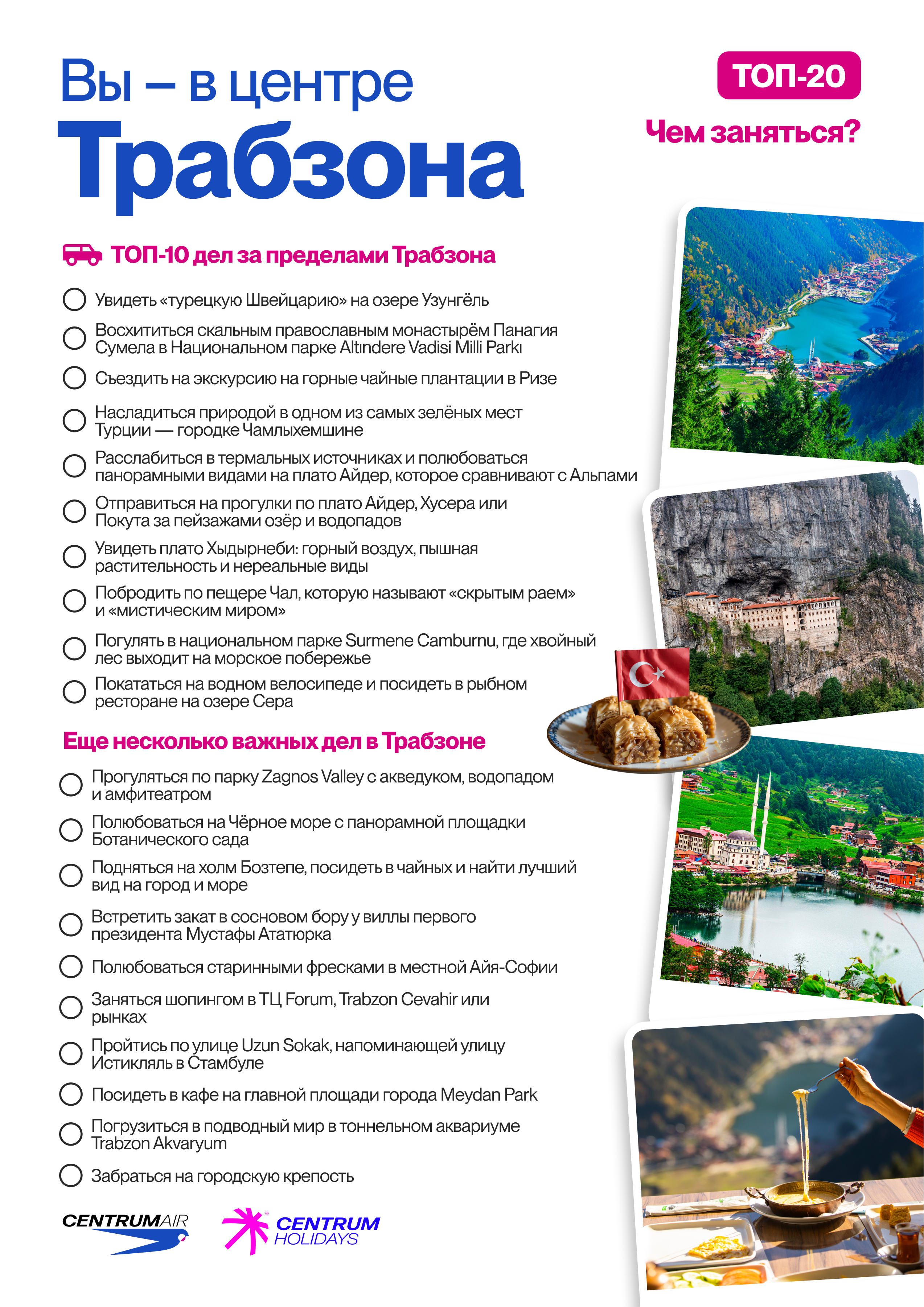 Трабзон – это про воздух, в котором больше природы, чем города. Здесь маршрут строится вокруг горизонта: море с одной стороны, горы с другой, а между ними – дороги, ведущие к тихим местам. Этот чек-лист поможет замедлиться, сменить ритм и прожить путешествие без спешки – с акцентом на ощущения.