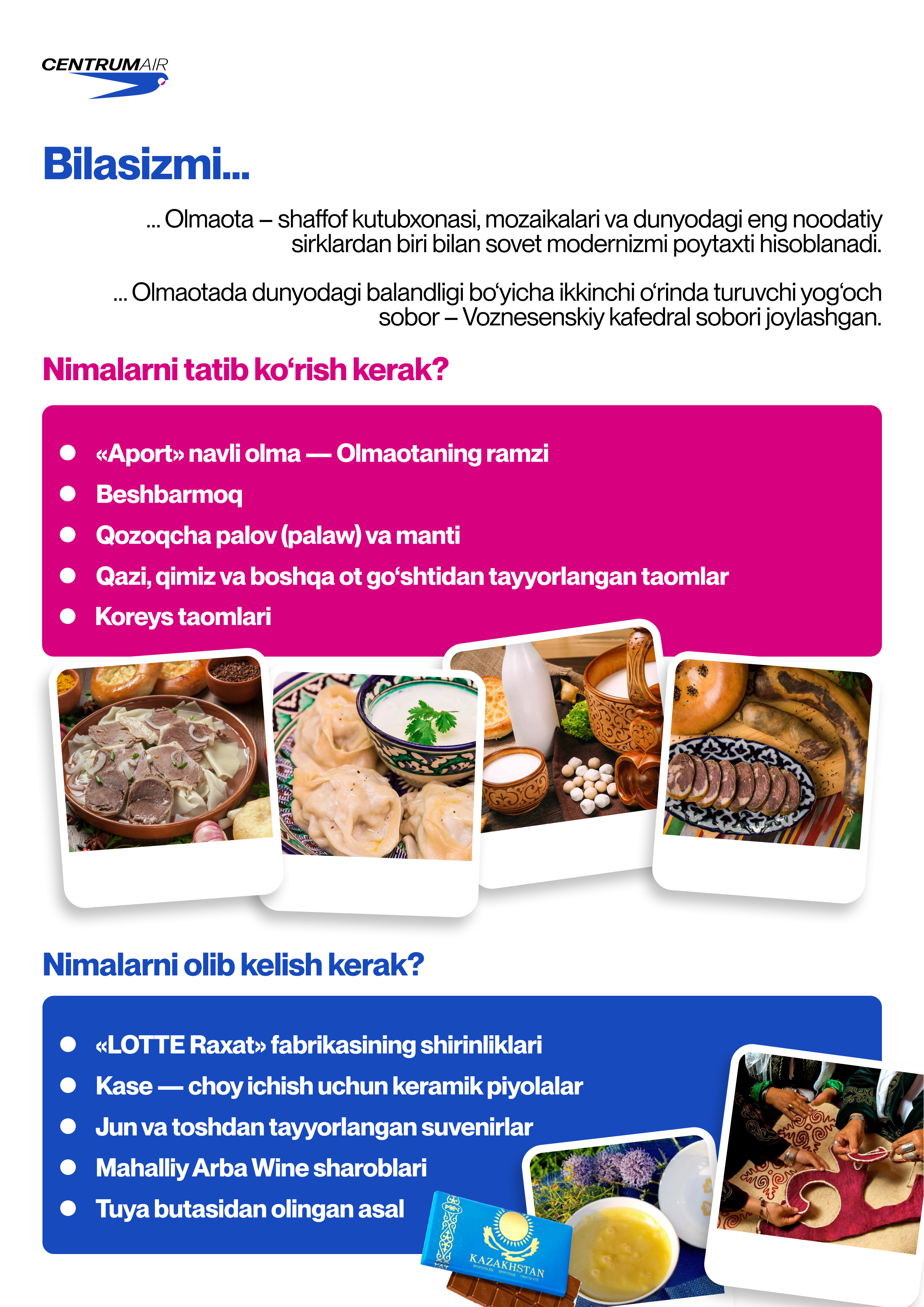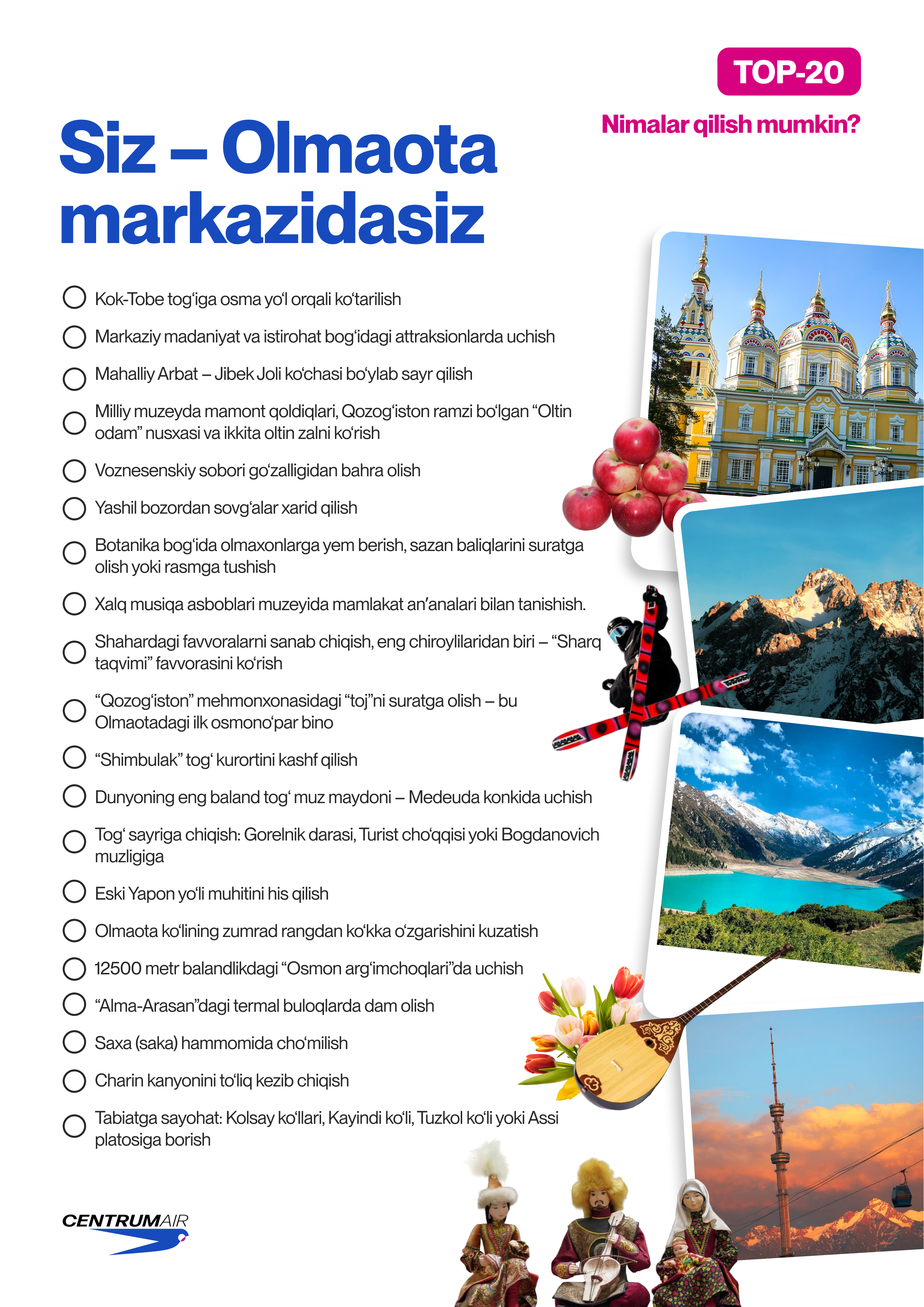 Olmaota – tongni tog‘larda boshlab, kechqurunini shahar chiroqlari qarshisidagi qulay kafelarda yakunlaydigan shahar. Bu yerda ritmni o‘zgartirish oson: faol ko‘tarilishlardan tortib, sokin sayrlarigacha. Ushbu chek-list sizga ideal sayohatingizni tuzish va Olmaotani turli kayfiyatlarda his qilishga yordam beradi.