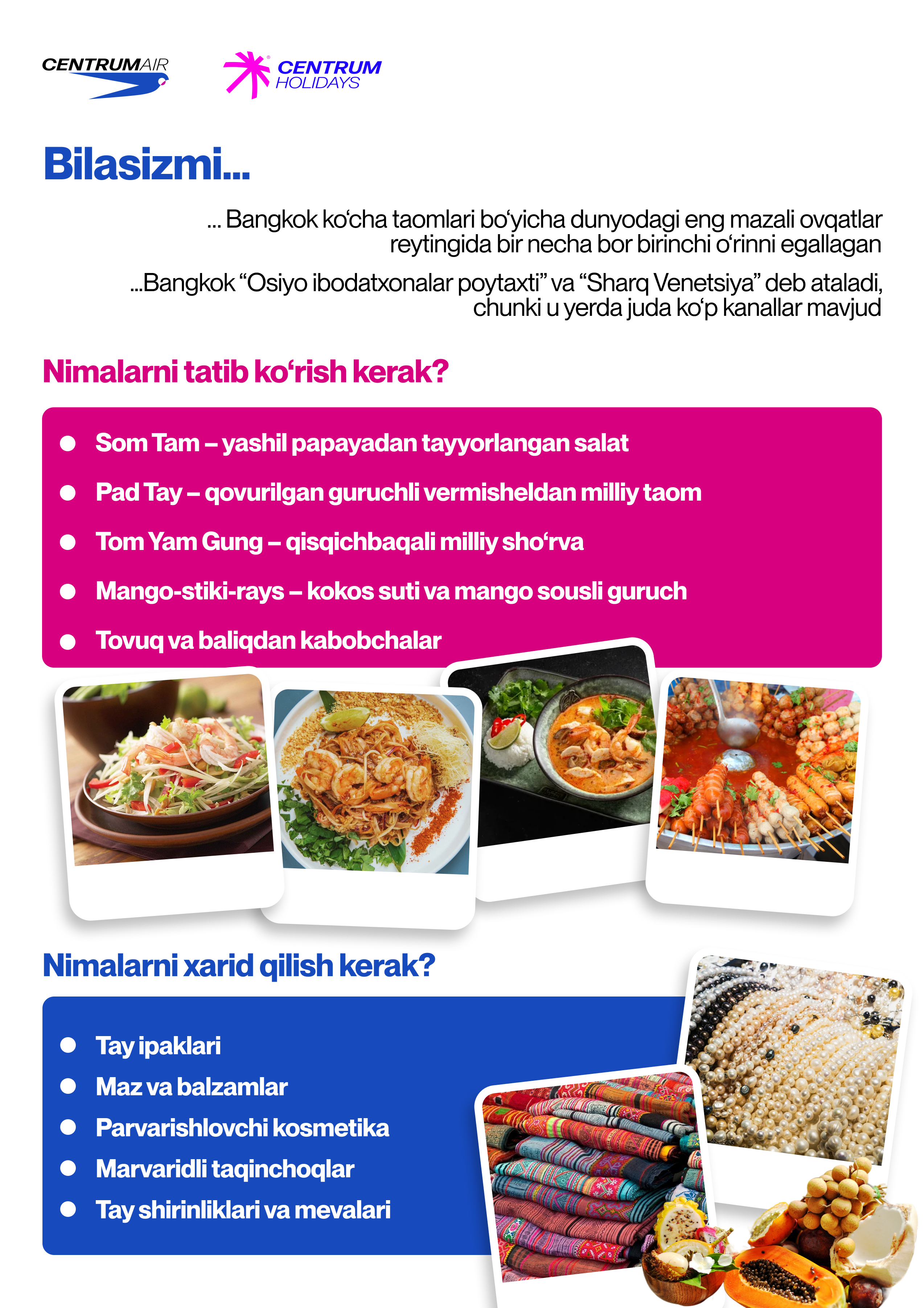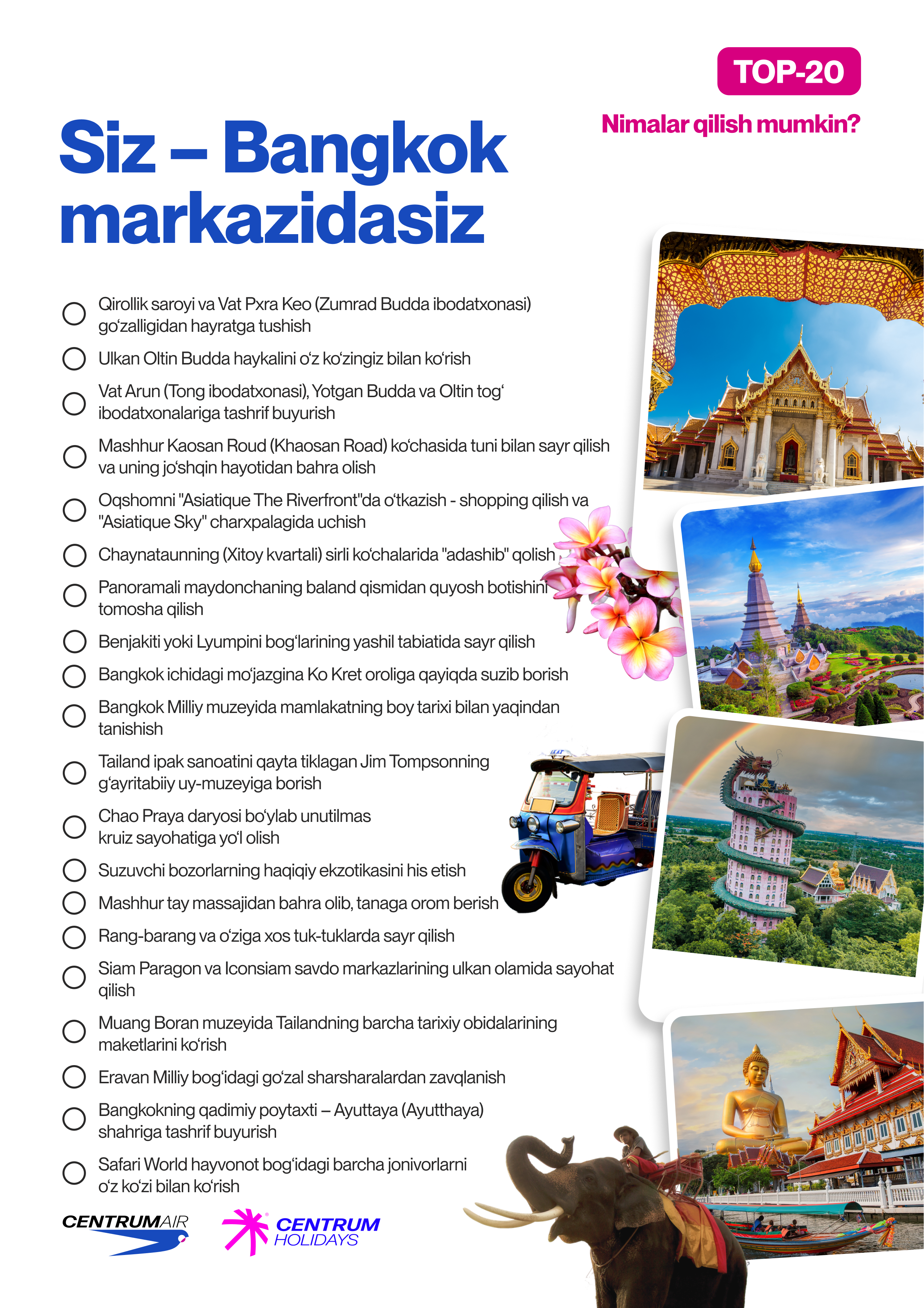 Bangkok – bir soniya ham to‘xtamaydigan shahar. Bu yerda oltin ibodatxonalar neon chiroqlar bilan, bozorlar osmono‘par binolar bilan uyg‘unlashadi, ko‘cha taomlari esa madaniyatning bir qismiga aylanadi. Ushbu chek-list sizga shahar ritmini yo‘qotmasdan ideal sayohatni tuzishga yordam beradi – ilk qadamdan eng yorqin kashfiyotlargacha.