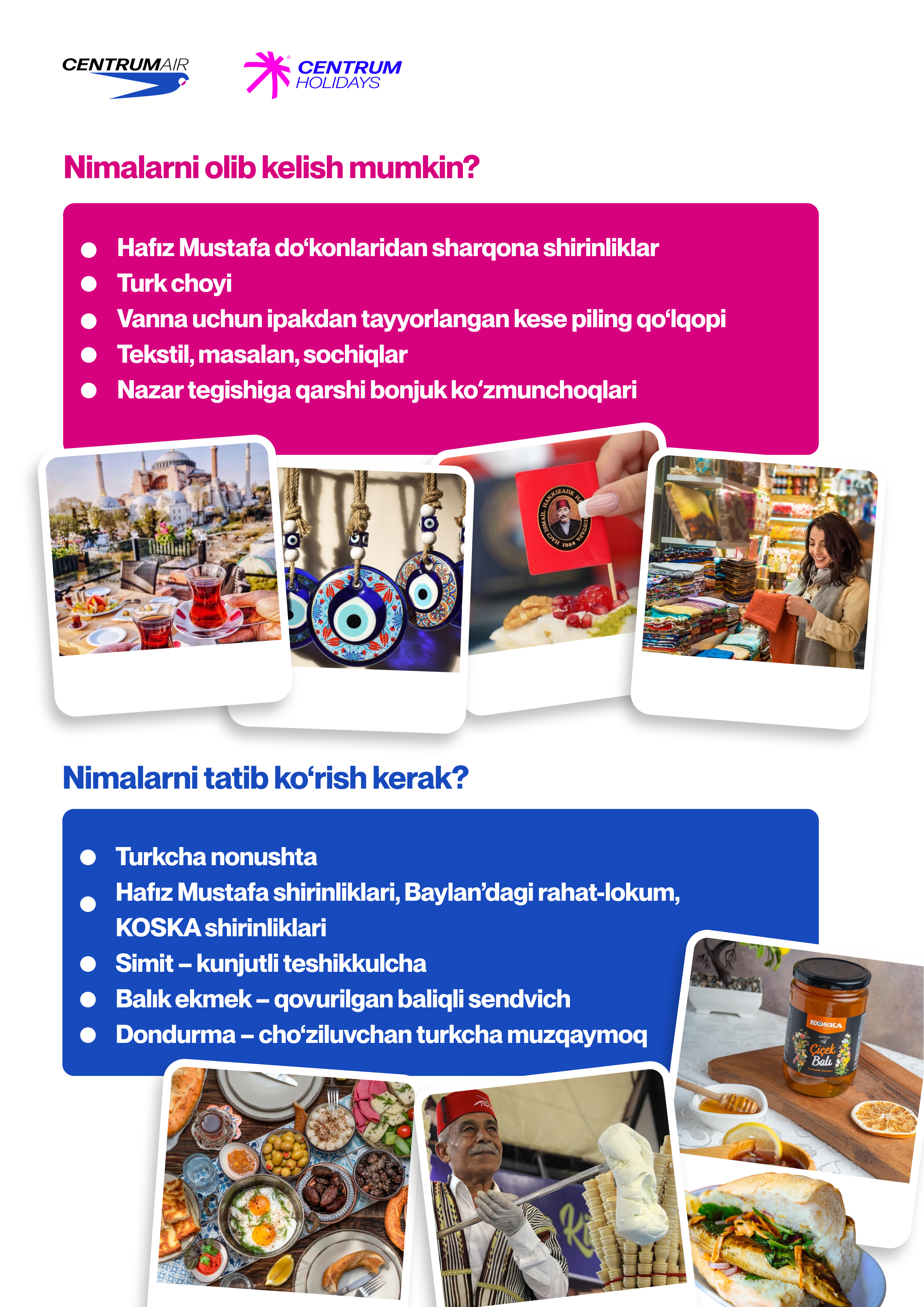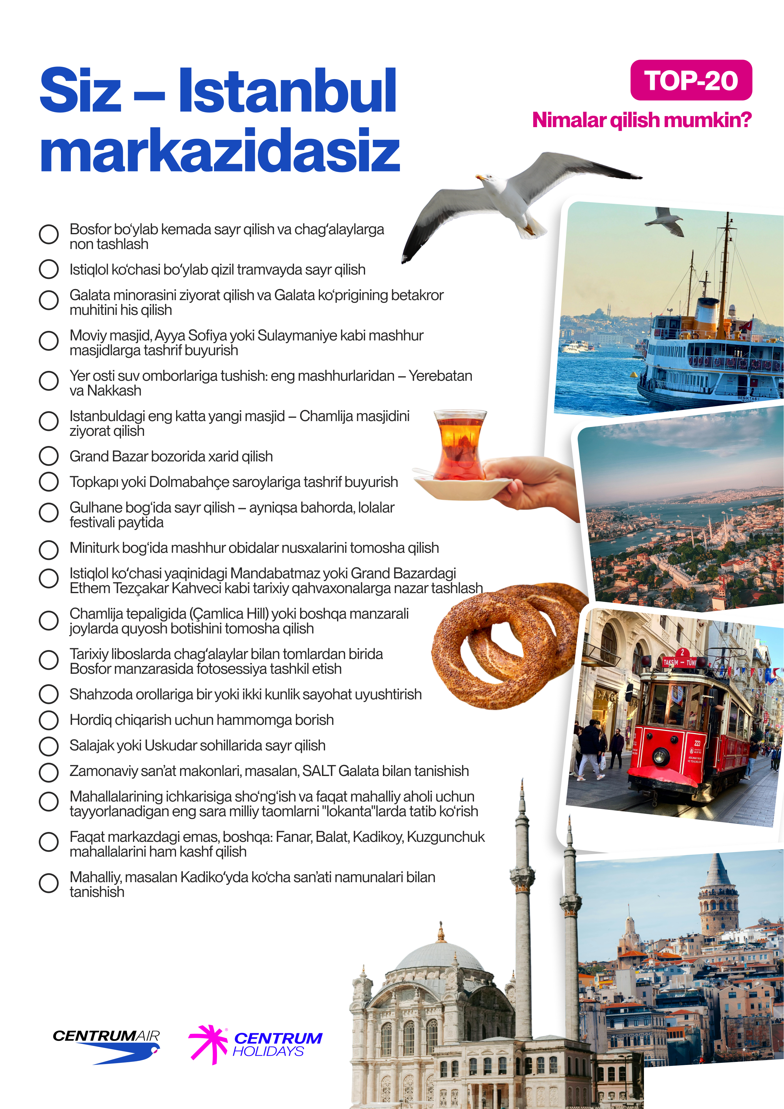 Istanbul turli ritmlar kesishgan shahar: tong azon bilan boshlanadi, kunduzi bozorlar va paromlar bilan to‘ladi, kechqurun esa Bosfor chiroqlarida eriydi. Bu yerda yo‘qolish ham, o‘z yo‘lingizni topish ham oson. Ushbu chek-list sizga Istanbulni bosqichma-bosqich ochib beradigan marshrut tuzishga yordam beradi – ilk taassurotlardan shaxsiy kashfiyotlargacha.