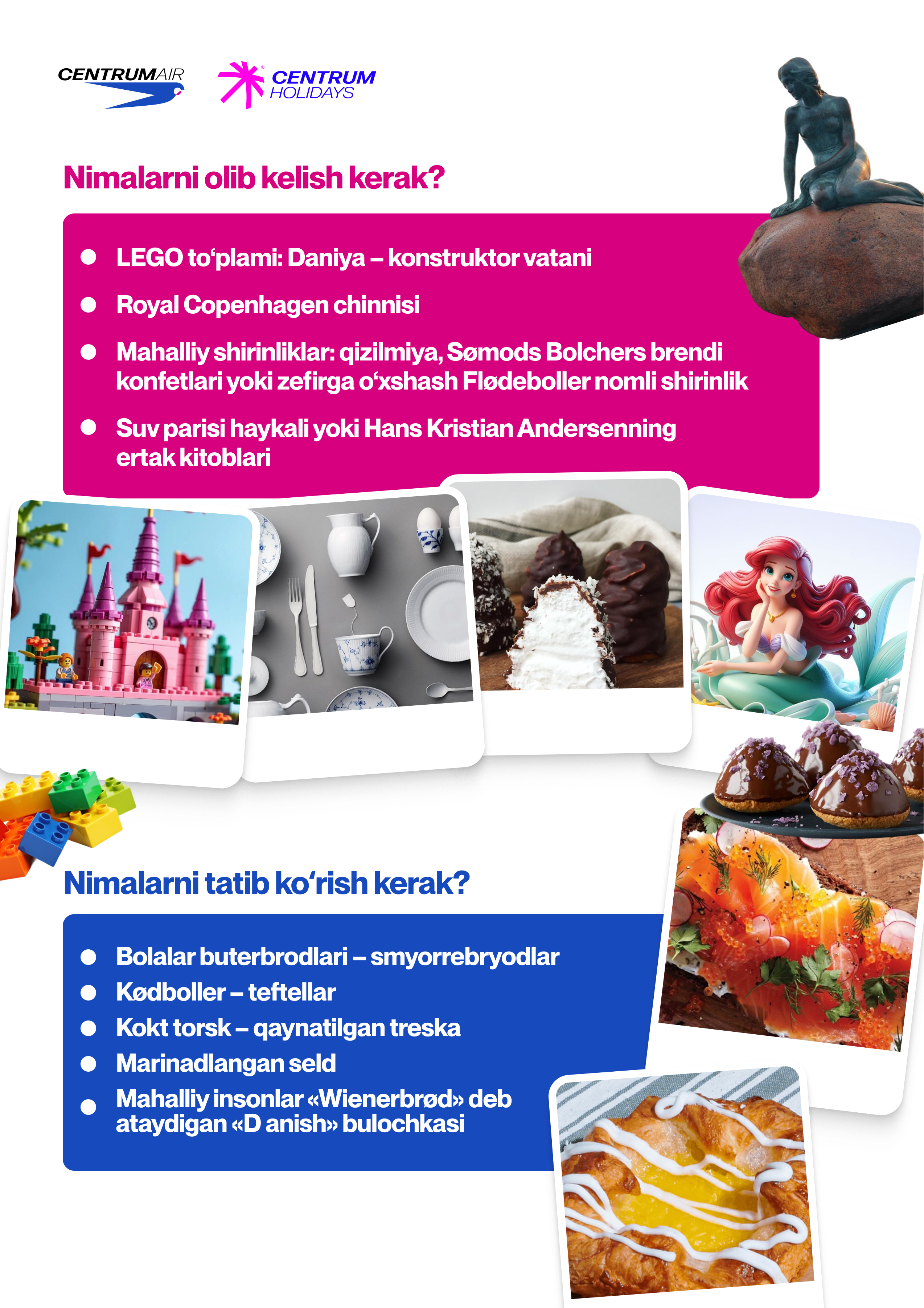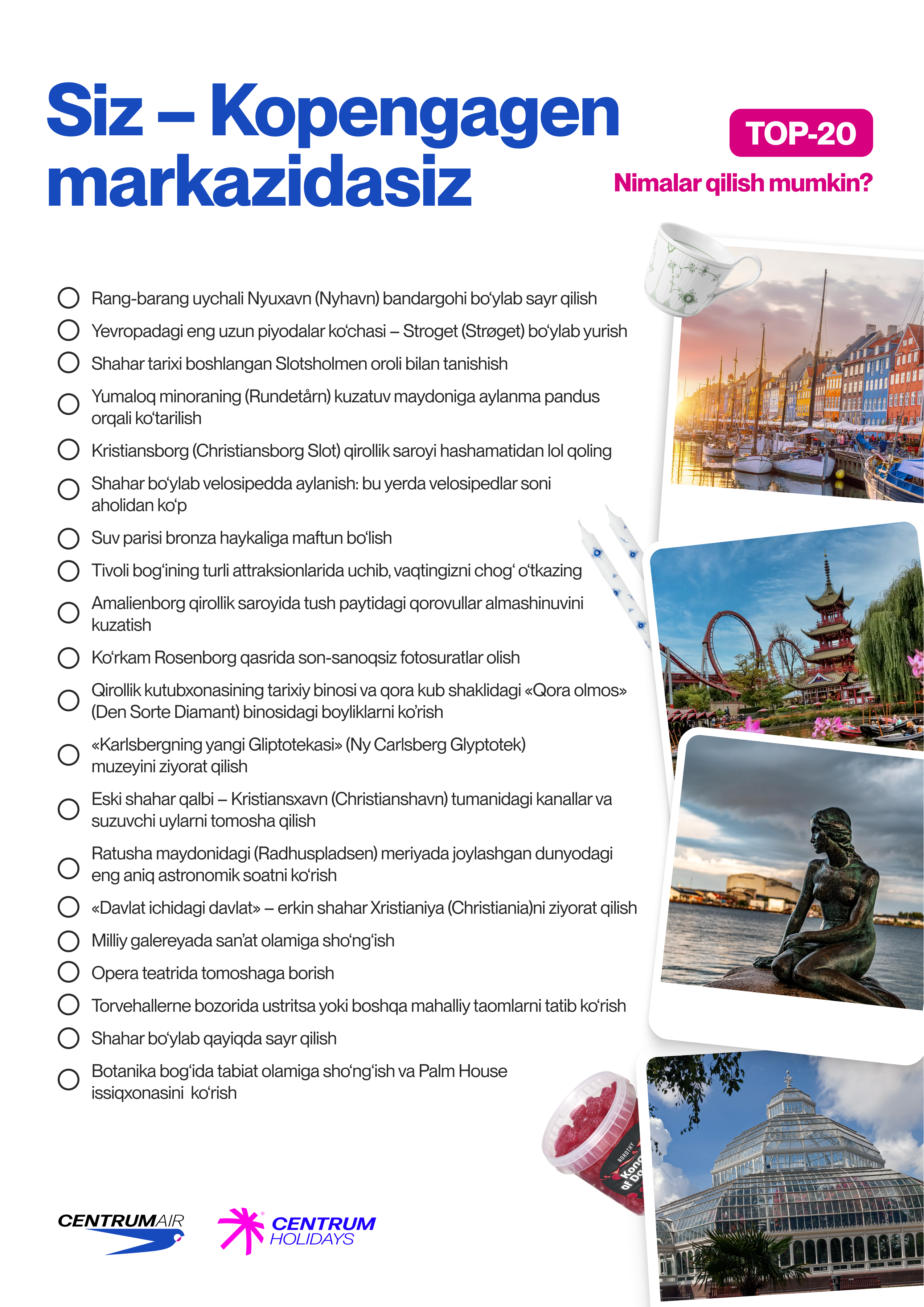 Kopengagen – har bir detali o‘ylangan shahar: sokin kanallardan tortib minimalistik kafelargacha va velosipedga mos ko‘chalargacha. Bu yerda shoshilish yo‘q, lekin o‘ziga xos ritm va qulaylik bor. Ushbu chek-list sizga arxitektura, taomlar va skandinaviya muhitini birlashtirgan marshrut tuzishga yordam beradi.
