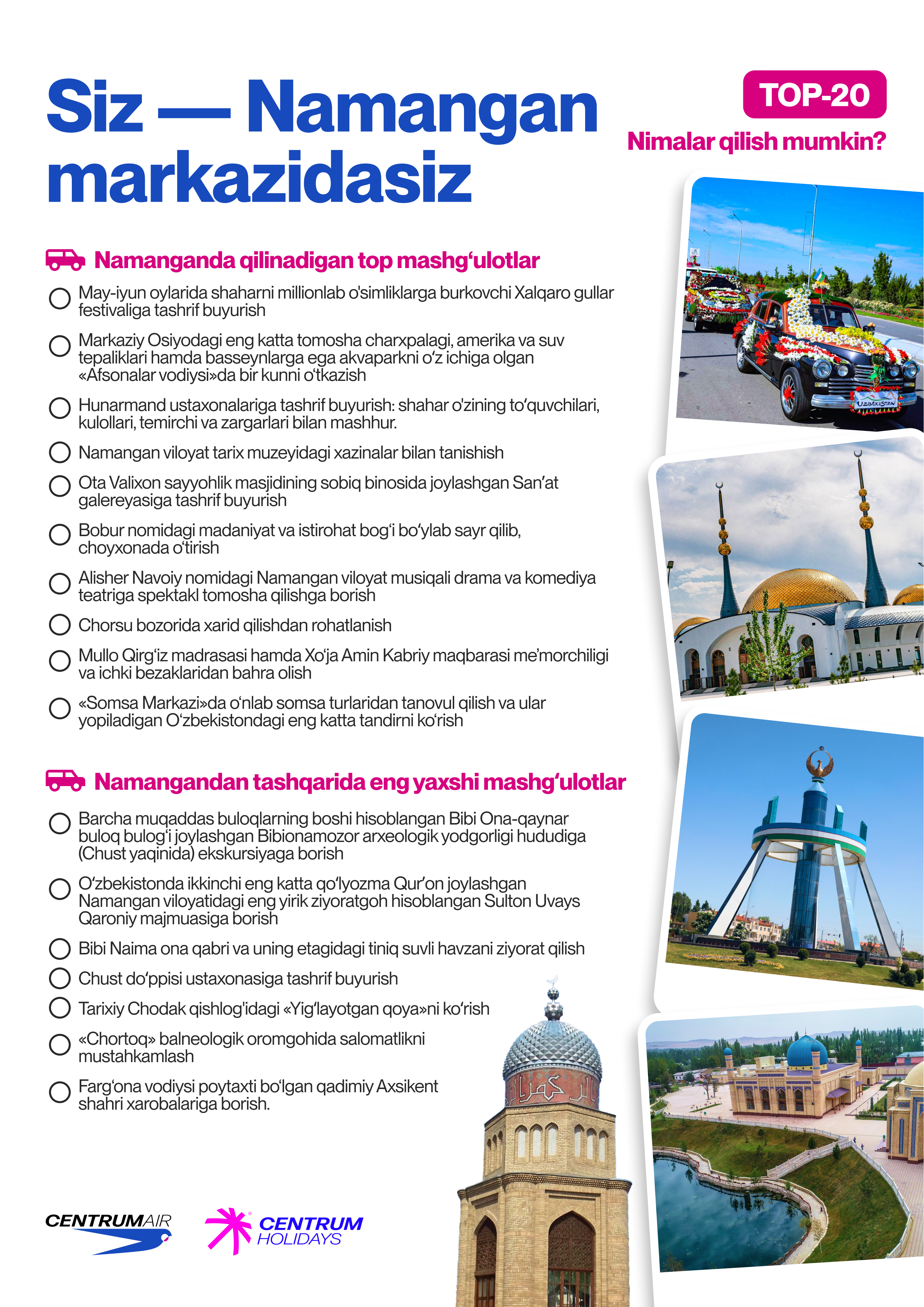 Namangan – Farg‘ona vodiysining eng yashil va o‘ziga xos shaharlaridan biri. Bu yerda soyali bog‘larda sayr qilish, qadimiy masjidlarni ko‘rish, sharqona bozorlarni kezish va vodiyning sokin hayot ritmini his qilish mumkin. Bahor kelganda esa mashhur gullar festivali tufayli shahar katta gulzorga aylanadi. Namangan bilan tanishish uchun eng qiziqarli joylar va taassurotlar chek-listini tayyorladik.