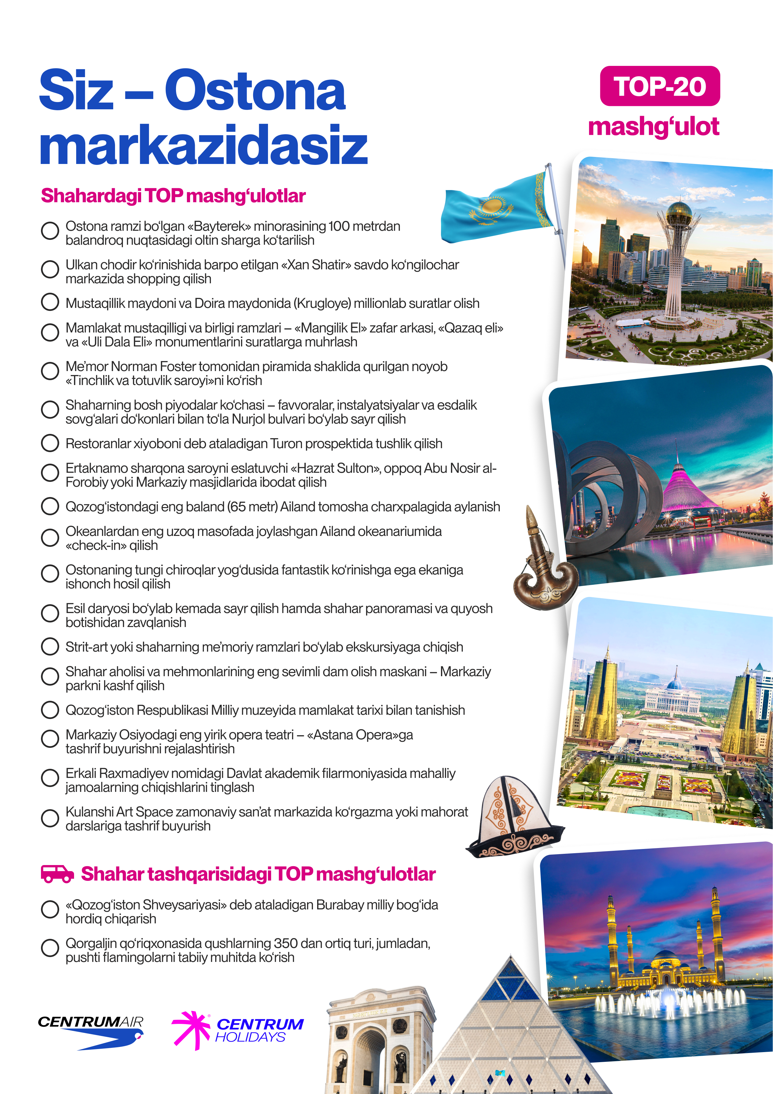 Ostona – kelajak shahrini eslatadigan poytaxt. Bu yerda futuristik binolar keng prospektlar, zamonaviy muzeylar va daryo bo‘yidagi sayr yo‘laklari bilan uyg‘unlashadi. Bayterek minorasiga chiqish, ulkan Khan Shatyr majmuasini ko‘rish, Ishim daryosi bo‘yida sayr qilish va Qozog‘iston poytaxtining zamonaviy madaniyatini his qilish mumkin. Astana bilan tanishishni boshlash uchun eng qiziqarli joylar va taassurotlar chek-listini tayyorladik.
