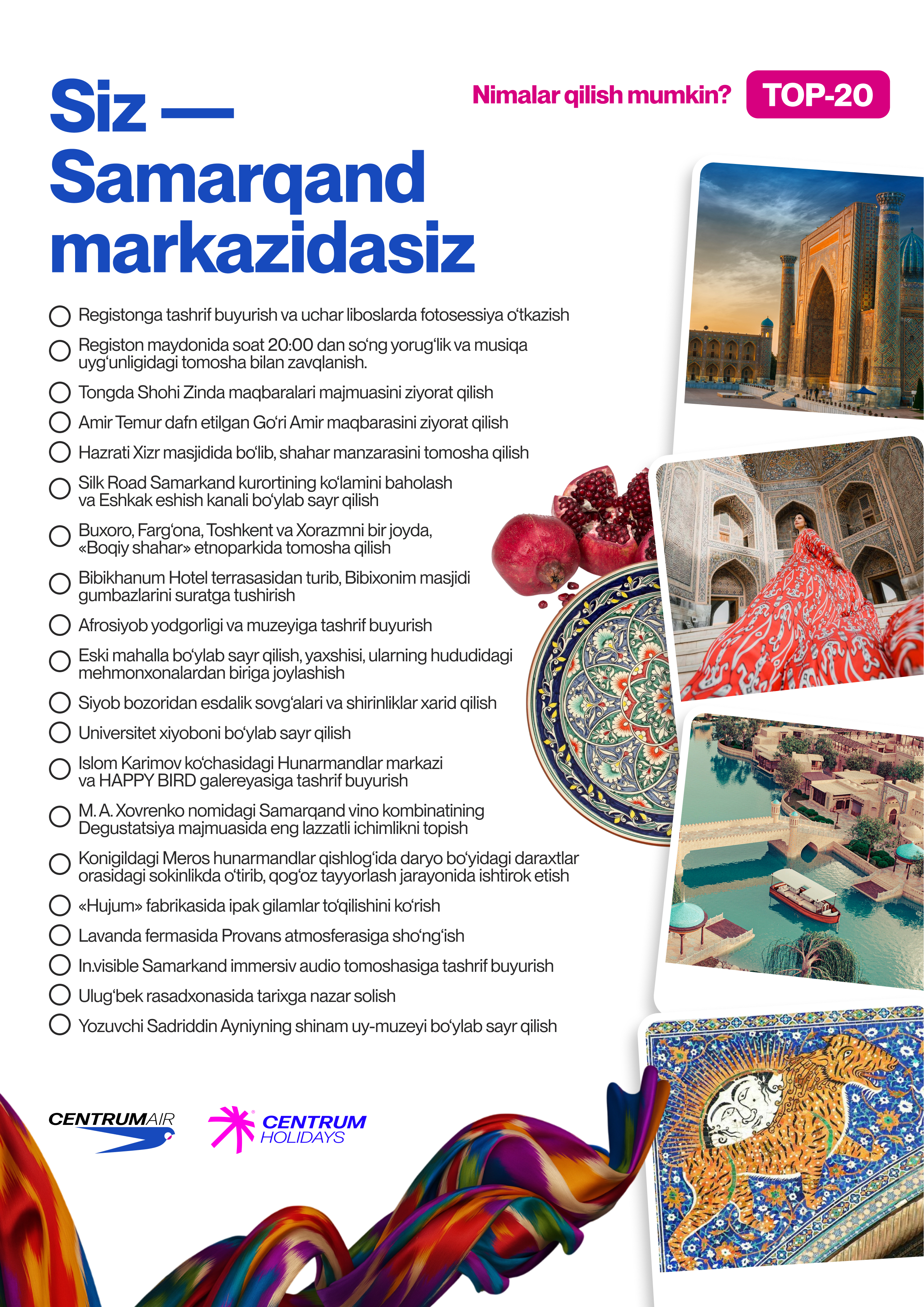 Samarqand – har bir qadamda tarix seziladigan shahar. Bu yerda moviy gumbazlar quyosh nurida porlaydi, shovqinli bozorlar Buyuk Ipak yo‘li davrini eslatadi, qadimiy maydonlar esa buyuk olimlar va hukmdorlar xotirasini saqlaydi. Samarqand bilan tanishishni boshlash uchun eng muhim joylar va taassurotlar chek-listini tayyorladik.