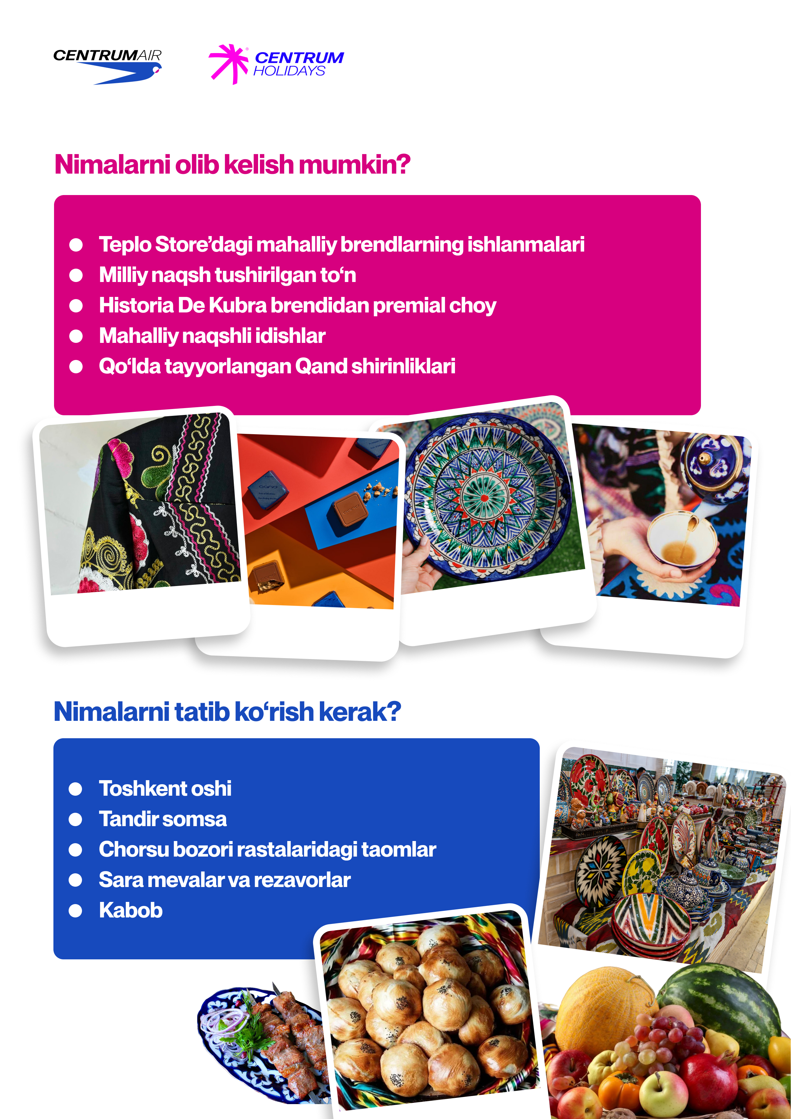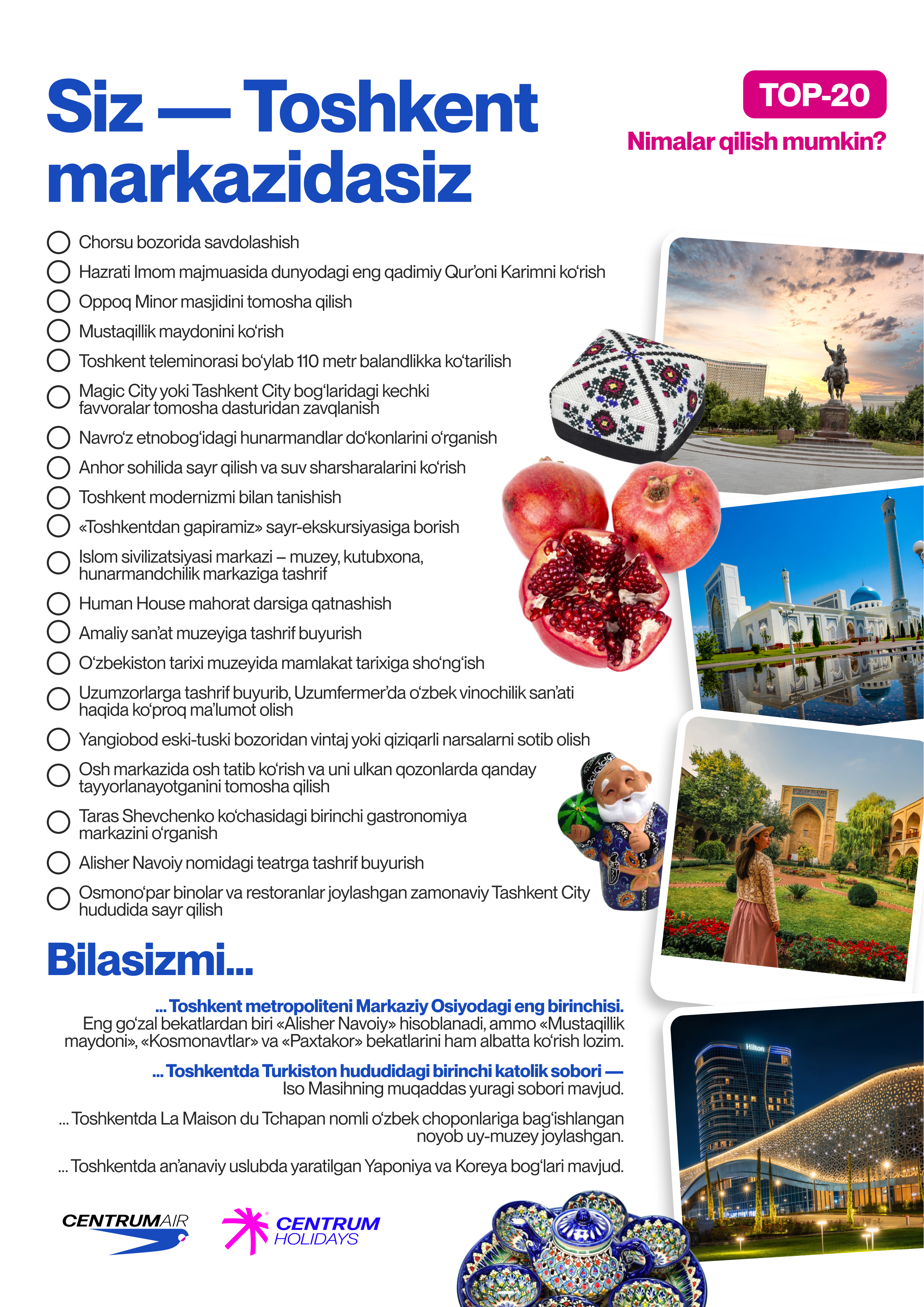 Toshkent — qadimiy sharqona an’analar va zamonaviy megapolis ritmi uyg‘unlashgan shahar. Bu yerda eski mahallalarda sayr qilish, shovqinli bozorlarni kezish, muzeylar va zamonaviy maskanlarni ko‘rish, so‘ngra yashil bog‘larda dam olib o‘zbek milliy taomlarini tatib ko‘rish mumkin. Toshkent bilan tanishishni boshlash uchun eng qiziqarli joylar va taassurotlar chek-listini tayyorladik.